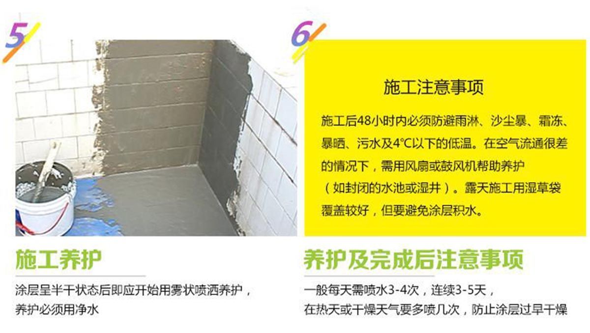 正確的固化對確保砂漿層的耐久性和質量是非常重要的。為了防止涂層表面產生裂縫、粉化,防水涂料涂層應保持潮濕,一旦施工后防水材料涂層開始固化即需開始養(yǎng)護,用噴霧水對防水材料涂層進行噴淋,一天需噴3~4次,如天熱,須增加噴淋的次數(shù)。施工后兩天內必須防雨淋、風沙、污水及霜凍。對于需要盛裝液體的混凝土構件,在養(yǎng)護三天后,再放置二周的時間,方可使用。