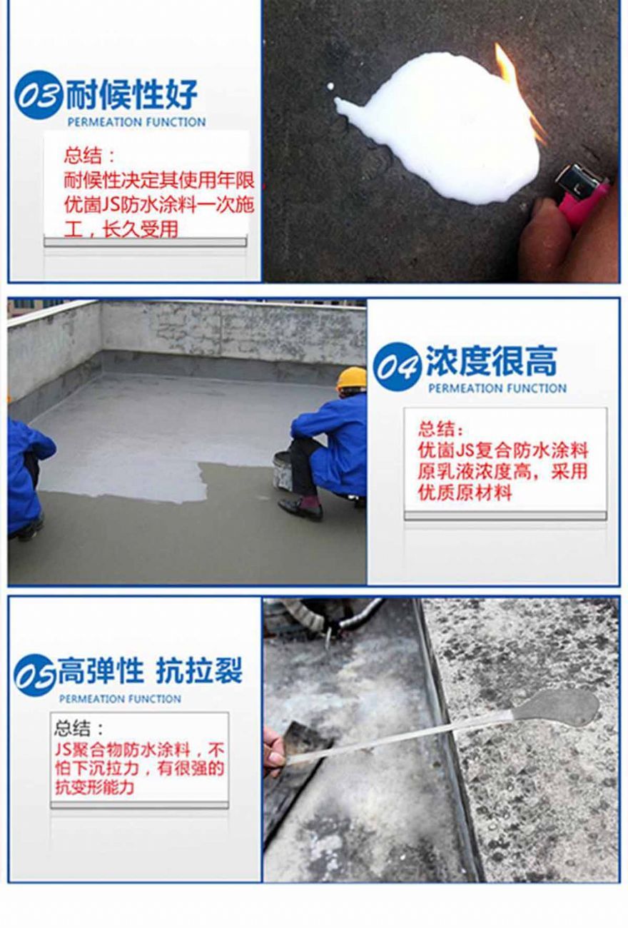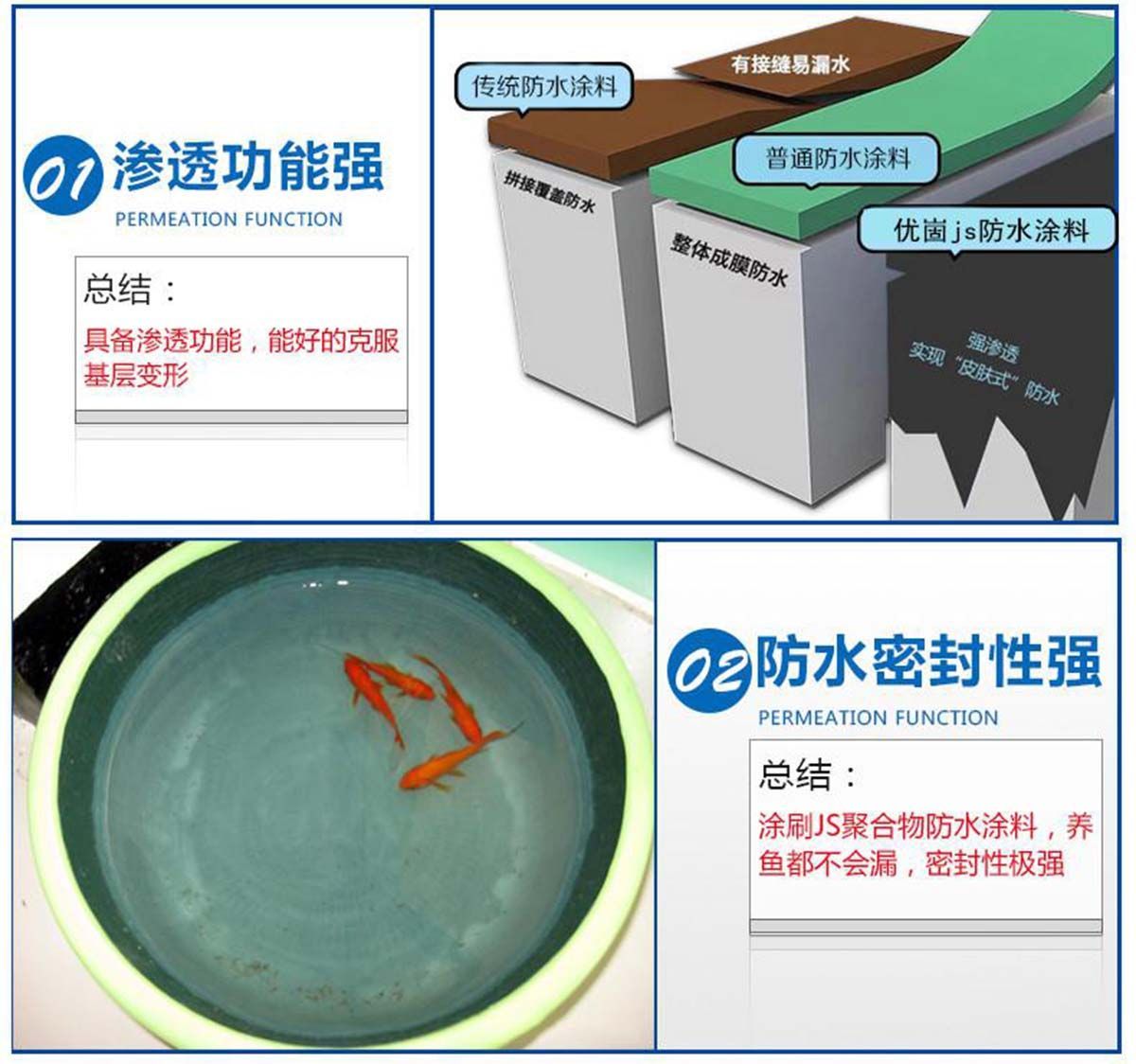①JS-Ⅰ型主要用于變形較大的部位如屋面、地下室等。.水性涂料,無毒、無害、無污染、是環(huán)保型涂料。可直接在混凝土表面施工并粘接牢固。冷施工,操作更方便,基層含水率不受限制,但基層表面不可有積水,工期短。凝結(jié)時(shí)間短,施工2小時(shí)后方可進(jìn)行下道施工工序。粘接性能佳。